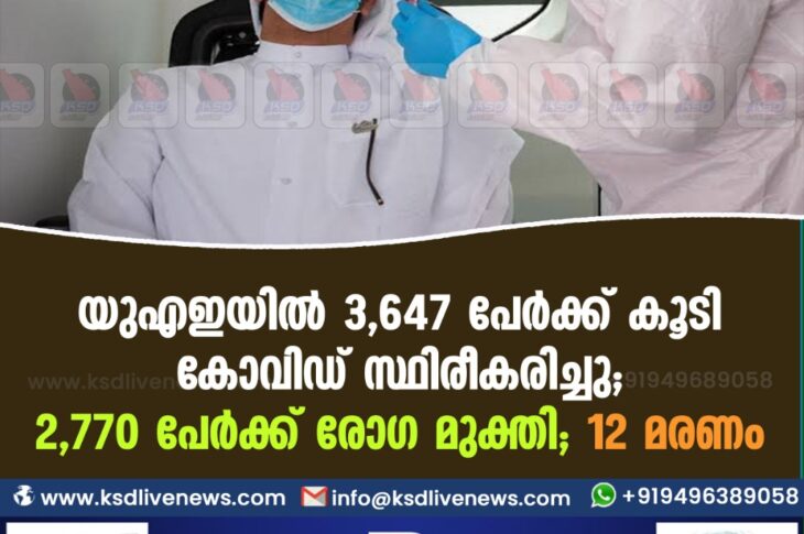 കോവിഡ് 19ഗൾഫ് യുഎഇയില് 3,647 പേര്ക്ക് കൂടി കോവിഡ് സ്ഥിരീകരിച്ചു;2,770 പേർക്ക് രോഗ മുക്തി;12 മരണം.January 30, 2021