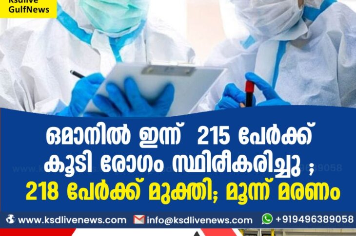 കോവിഡ് 19ഗൾഫ് ഒമാനില് ഇന്ന് 215 പേര്ക്ക് കൂടി രോഗം സ്ഥിരീകരിച്ചു ; 218 പേർക്ക് മുക്തി ; മൂന്ന് മരണംDecember 15, 2020