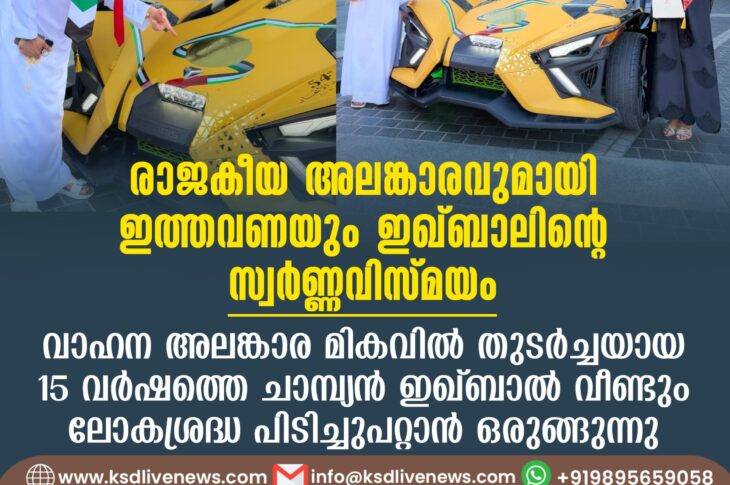 ഗൾഫ് രാജകീയ അലങ്കാരവുമായി ഇത്തവണയും ഇഖ്ബാലിൻ്റെ സ്വർണ്ണവിസ്മയം: വാഹന അലങ്കാര മികവിൽ തുടർച്ചയായ 15 വർഷത്തെ ചാമ്പ്യൻ ഇഖ്ബാൽ വീണ്ടും ലോകശ്രദ്ധ പിടിച്ചുപറ്റാൻ ഒരുങ്ങുന്നുDecember 1, 2025
