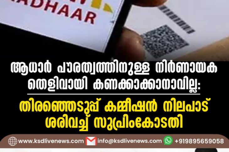 ദേശീയം ആധാര് പൗരത്വത്തിനുള്ള നിര്ണായക തെളിവായി കണക്കാക്കാനാവില്ല: തിരഞ്ഞെടുപ്പ് കമ്മീഷന് നിലപാട് ശരിവച്ച് സുപ്രിംകോടതിAugust 12, 2025