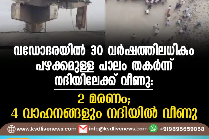 ദേശീയം വഡോദരയില് 30 വര്ഷത്തിലധികം പഴക്കമുള്ള പാലം തകര്ന്ന് നദിയിലേക്ക് വീണു, 2 മരണം; 4 വാഹനങ്ങളും നദിയില് വീണുJuly 9, 2025