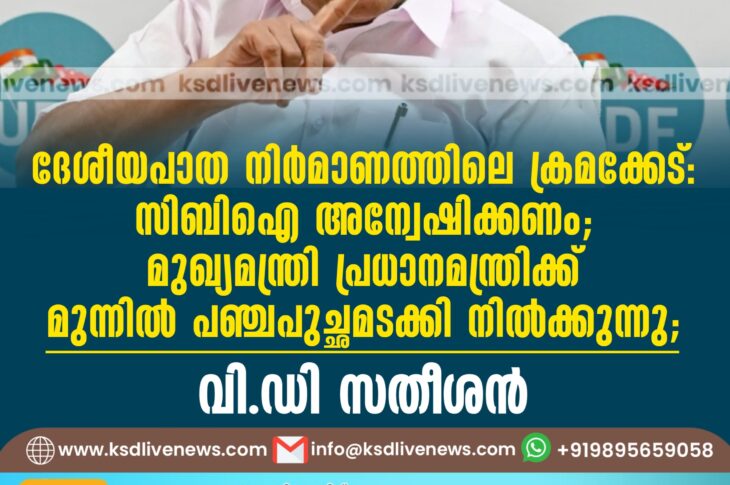 ദേശീയം ദേശീയപാത നിര്മാണത്തിലെ ക്രമക്കേട്: സിബിഐ അന്വേഷിക്കണം; മുഖ്യമന്ത്രി പ്രധാനമന്ത്രിക്ക് മുന്നില് പഞ്ചപുച്ഛമടക്കി നില്ക്കുന്നു; വി.ഡി സതീശന്June 4, 2025