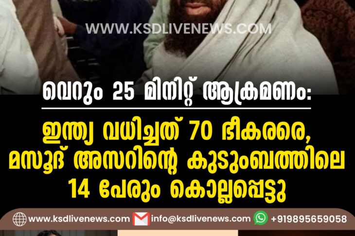 ദേശീയം വെറും 25 മിനിറ്റ് ആക്രമണം; ഇന്ത്യ വധിച്ചത് 70 ഭീകരരെ, മസൂദ് അസറിന്റെ കുടുംബത്തിലെ 14 പേരും കൊല്ലപ്പെട്ടുMay 7, 2025