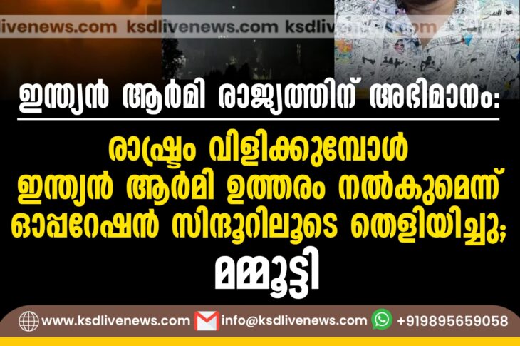 ദേശീയം ഇന്ത്യൻ ആര്മി രാജ്യത്തിന് അഭിമാനം: രാഷ്ട്രം വിളിക്കുമ്പോള് ഇന്ത്യൻ ആര്മി ഉത്തരം നല്കുമെന്ന് ഓപ്പറേഷൻ സിന്ദൂറിലൂടെ തെളിയിച്ചു; മമ്മൂട്ടിMay 7, 2025