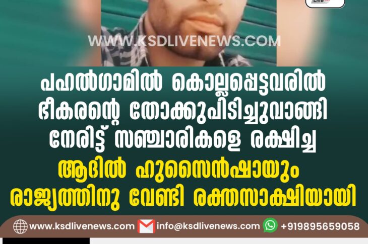 ദേശീയം പഹല്ഗാമില് കൊല്ലപ്പെട്ടവരില് ഭീകരൻ്റെ തോക്കുപിടിച്ചുവാങ്ങി നേരിട്ട്: സഞ്ചാരികളെ രക്ഷിച്ച ആദില് ഹുസൈന്ഷായും രാജ്യത്തിനു വേണ്ടി രക്തസാക്ഷിയായിApril 23, 2025