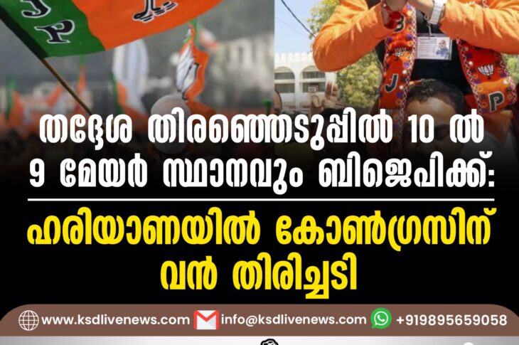 ദേശീയം തദ്ദേശ തിരഞ്ഞെടുപ്പില് 10 ല് 9 മേയര് സ്ഥാനവും ബിജെപിക്ക്: ഹരിയാണയില് കോണ്ഗ്രസിന് വന് തിരിച്ചടിMarch 12, 2025