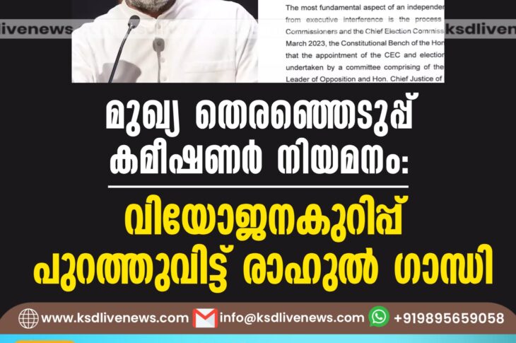 ദേശീയം മുഖ്യ തെരഞ്ഞെടുപ്പ് കമീഷണർ നിയമനം: വിയോജനകുറിപ്പ് പുറത്തുവിട്ട് രാഹുൽ ഗാന്ധിFebruary 18, 2025