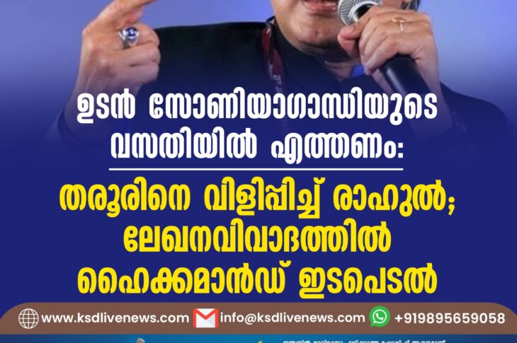 ദേശീയം ഉടൻ സോണിയാഗാന്ധിയുടെ വസതിയിൽ എത്തണം: തരൂരിനെ വിളിപ്പിച്ച് രാഹുൽ; ലേഖനവിവാദത്തിൽ ഹൈക്കമാൻഡ് ഇടപെടൽFebruary 18, 2025