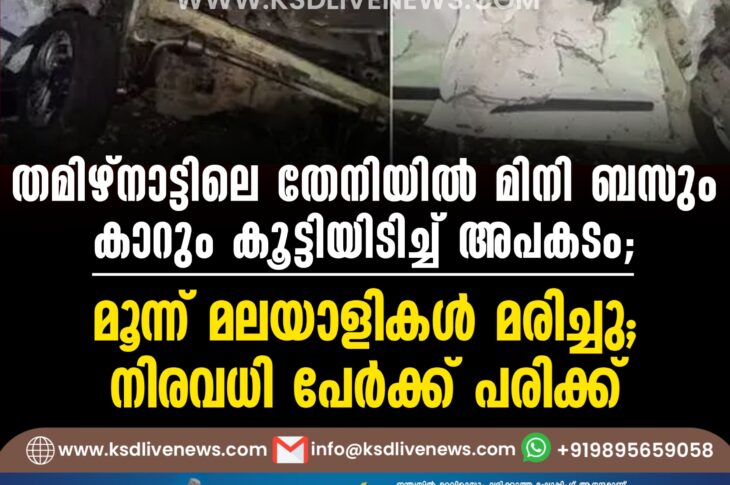 ദേശീയം തമിഴ്നാട്ടിലെ തേനിയില് മിനി ബസും കാറും കൂട്ടിയിടിച്ച് അപകടം; മൂന്ന് മലയാളികള് മരിച്ചു, നിരവധിപേര്ക്ക് പരിക്ക്December 28, 2024