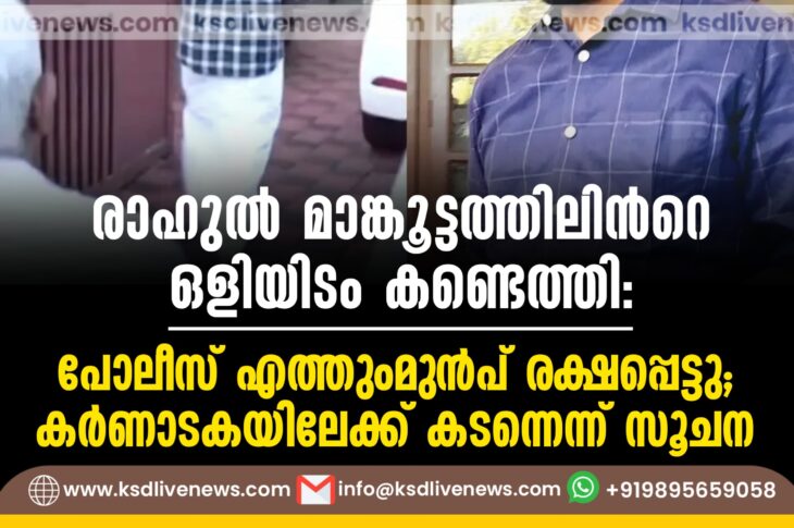 ദേശീയം രാഹുൽ മാങ്കൂട്ടത്തിലിന്റെ ഒളിയിടം കണ്ടെത്തി: പോലീസ് എത്തുംമുൻപ് രക്ഷപ്പെട്ടു; കർണാടകയിലേക്ക് കടന്നെന്ന് സൂചനDecember 2, 2025