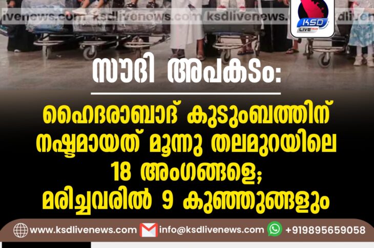 ദേശീയം സൗദി അപകടം: ഹൈദരാബാദ് കുടുംബത്തിന് നഷ്ടമായത് മൂന്നു തലമുറയിലെ 18 അംഗങ്ങളെ, മരിച്ചവരിൽ 9 കുഞ്ഞുങ്ങളുംNovember 18, 2025