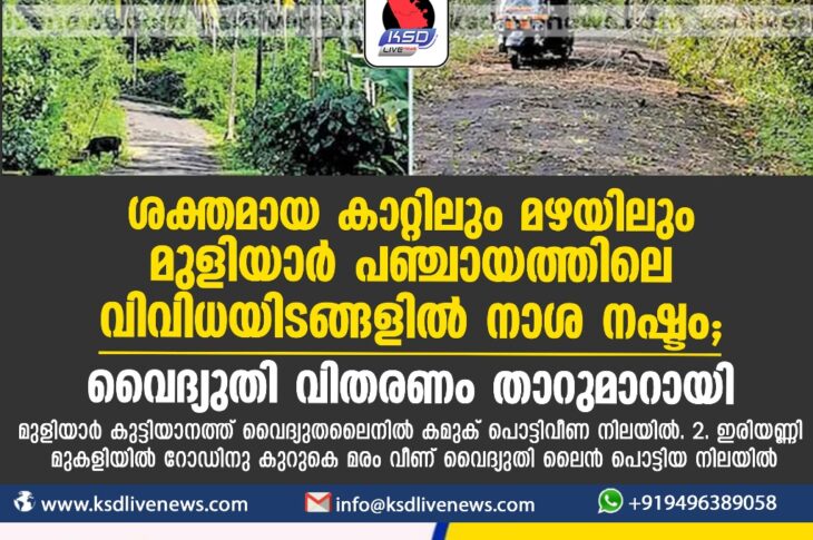 പ്രാദേശികം ശക്തമായ കാറ്റിലും മഴയിലും മുളിയാർ പഞ്ചായത്തിലെ വിവിധയിടങ്ങളിൽ നാശ നഷ്ടം; വൈദ്യുതി വിതരണം താറുമാറായിNovember 4, 2023