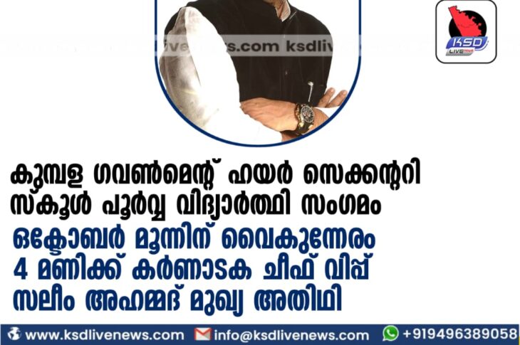പ്രാദേശികം കുമ്പള ഗവൺമെൻറ് ഹയർ സെക്കന്ററി സ്കൂൾ പൂർവ്വ വിദ്യാർത്ഥി സംഗമം ഒക്ടോബർ മൂന്നിന് വൈകുന്നേരം 4 മണിക്ക് കർണാടക ചീഫ് വിപ്പ് സലീം അഹമ്മദ് മുഖ്യ അതിഥിOctober 2, 2023