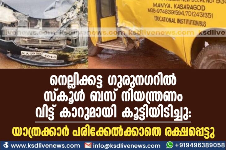 പ്രാദേശികം നെല്ലിക്കട്ട ഗുരുനഗറിൽ സ്കൂള് ബസ് നിയന്ത്രണം വിട്ട് കാറുമായി കൂട്ടിയിടിച്ചു: യാത്രക്കാർ പരിക്കേല്ക്കാതെ രക്ഷപ്പെട്ടുSeptember 29, 2023
