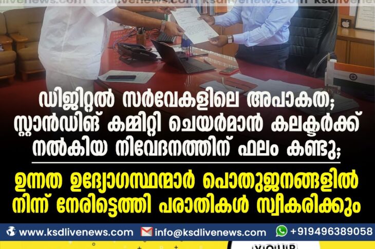 പ്രാദേശികം ഡിജിറ്റൽ സർവേകളിലെ അപാകത; സ്റ്റാൻഡിങ് കമ്മിറ്റി ചെയർമാൻ കലക്ടർക്ക് നൽകിയ നിവേദനത്തിന് ഫലം കണ്ടു: ഉന്നത ഉദ്യോഗസ്ഥന്മാർ പൊതുജനങ്ങളിൽ നിന്ന് നേരിട്ടെത്തി പരാതികൾ സ്വീകരിക്കുംJuly 3, 2023