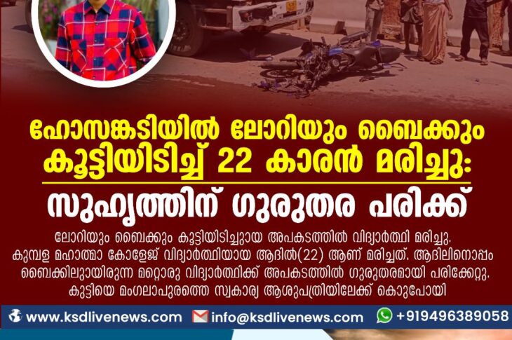 പ്രാദേശികം ഹോസങ്കടിയിൽ ലോറിയും ബൈക്കും കൂട്ടിയിടിച്ച് 22 കാരൻ മരിച്ചു : സുഹൃത്തിന് ഗുരുതര പരിക്ക്March 28, 2023