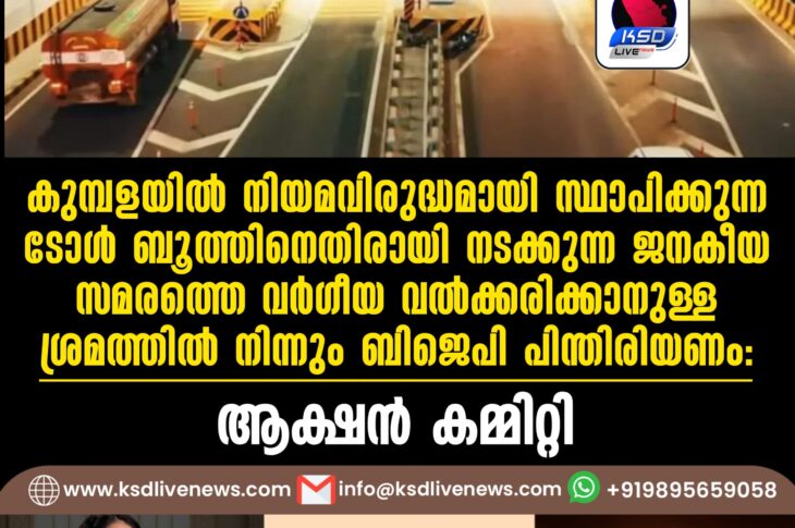 പ്രാദേശികം കുമ്പളയിൽ നിയമവിരുദ്ധമായി സ്ഥാപിക്കുന്ന ടോൾ ബൂത്തിനെതിരായി നടക്കുന്ന ജനകീയ സമരത്തെ വർഗീയ വൽക്കരിക്കാനുള്ള ശ്രമത്തിൽ നിന്നും ബിജെപി പിന്തിരിയണം: ആക്ഷൻ കമ്മിറ്റിSeptember 16, 2025