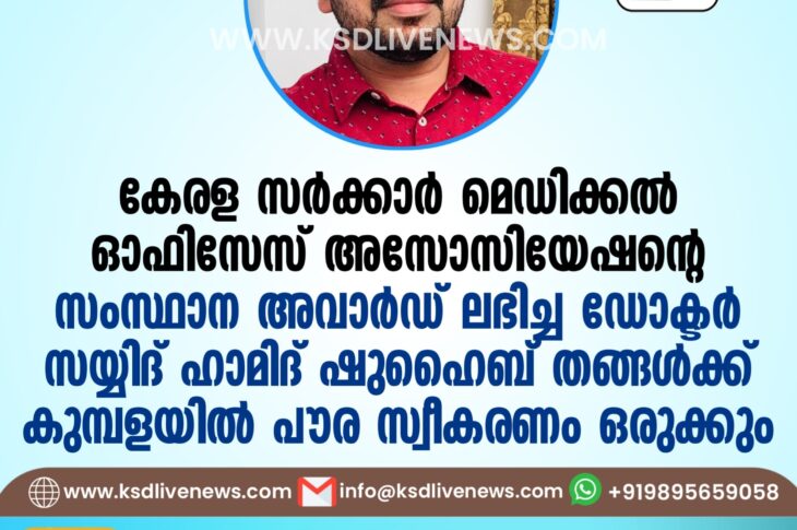പ്രാദേശികം കേരള സർക്കാർ മെഡിക്കൽ ഓഫിസേസ് അസോസിയേഷന്റെ സംസ്ഥാന അവാർഡ് ലഭിച്ച ഡോക്ടർ സയ്യിദ് ഹാമിദ് ഷുഹൈബ് തങ്ങൾക്ക് കുമ്പള യിൽ പൗര സ്വീകരണം ഒരുക്കുംJanuary 13, 2025
