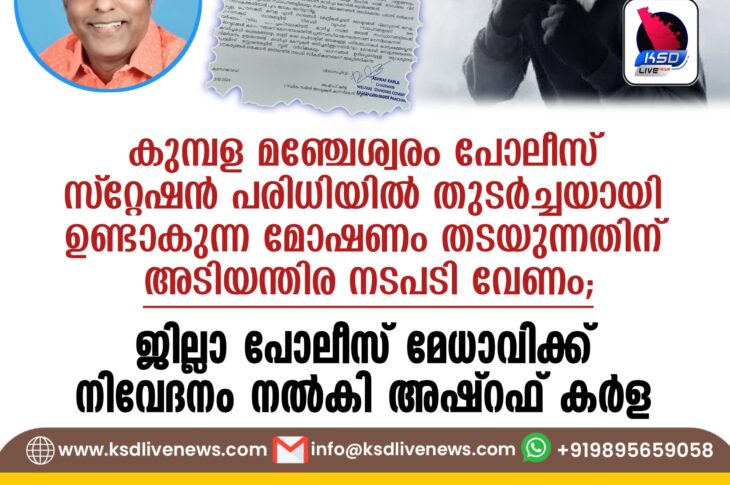 പ്രാദേശികം കുമ്പള മഞ്ചേശ്വരം പോലീസ് സ്റ്റേഷൻ പരിധിയിൽ തുടർച്ചയായി ഉണ്ടാകുന്ന മോഷണം തടയുന്നതിന് അടിയന്തിര നടപടി വേണം; ജില്ലാ പോലീസ് മേധാവിക്ക് നിവേദനം നൽകി അഷ്റഫ് കർളDecember 23, 2024