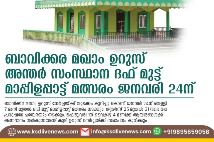 പ്രാദേശികം ബാവിക്കര മഖാം ഉറുസ് അന്തർ സംസ്ഥാന ദഫ് മുട്ട് മാപ്പിളപ്പാട്ട് മത്സരം ജനവരി 24ന്December 11, 2024