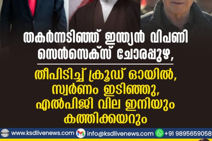 വിദേശം തകർന്നടിഞ്ഞ് ഇന്ത്യൻ വിപണി; സെൻസെക്സ് ചോരപ്പുഴ, തീപിടിച്ച് ക്രൂഡ് ഓയിൽ, സ്വർണം ഇടിഞ്ഞു, എൽപിജി വില ഇനിയും കത്തിക്കയറുംMarch 9, 2026