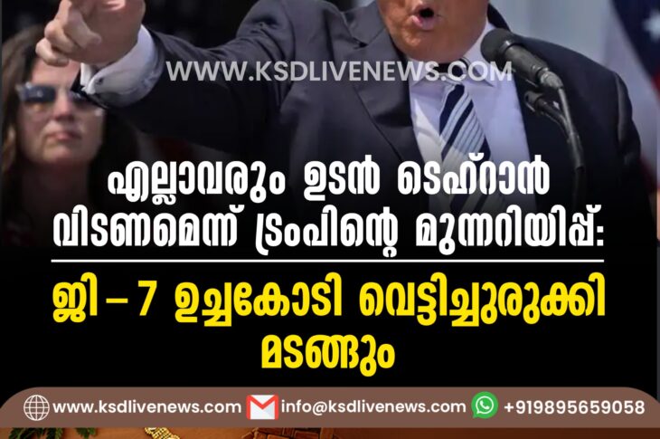 വിദേശം എല്ലാവരും ഉടന് ടെഹ്റാൻ വിടണമെന്ന് ട്രംപിന്റെ മുന്നറിയിപ്പ്; ജി-7 ഉച്ചകോടി വെട്ടിച്ചുരുക്കി മടങ്ങുംJune 17, 2025