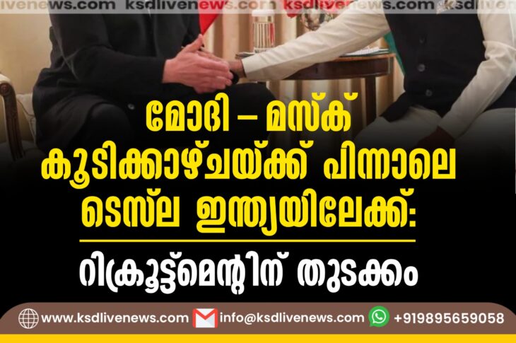 വിദേശം മോദി-മസ്ക് കൂടിക്കാഴ്ചയ്ക്ക് പിന്നാലെ ടെസ്ല ഇന്ത്യയിലേക്ക്?; റിക്രൂട്ട്മെന്റിന് തുടക്കംFebruary 18, 2025