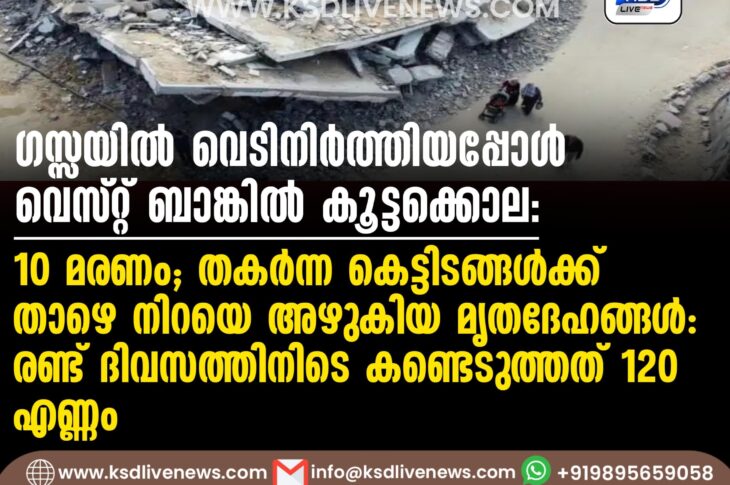 വിദേശം ഗസ്സയില് വെടിനിര്ത്തിയപ്പോള് വെസ്റ്റ് ബാങ്കില് കൂട്ടക്കൊല, 10 മരണം; തകര്ന്ന കെട്ടിടങ്ങള്ക്ക് താഴെ നിറയെ അഴുകിയ മൃതദേഹങ്ങള്; രണ്ട് ദിവസത്തിനിടെ കണ്ടെടുത്തത് 120 എണ്ണംJanuary 22, 2025