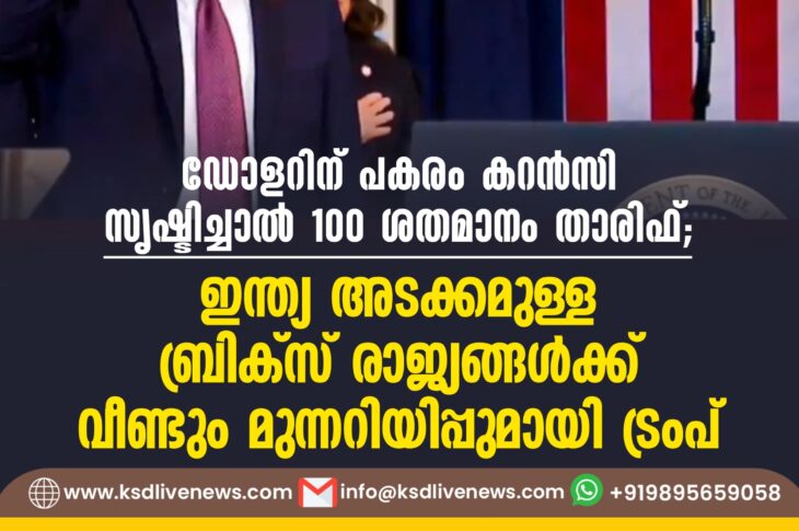 വിദേശം ഡോളറിന് പകരം കറന്സി സൃഷ്ടിച്ചാല് 100 ശതമാനം താരിഫ്; ഇന്ത്യ അടക്കമുള്ള ബ്രിക്സ് രാജ്യങ്ങള്ക്ക് വീണ്ടും മുന്നറിയിപ്പുമായി ട്രംപ്January 22, 2025