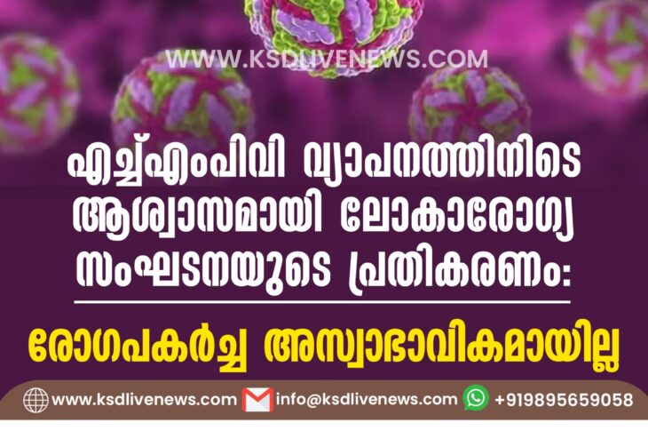 വിദേശം എച്ച്എംപിവി വ്യാപനത്തിനിടെ ആശ്വാസമായി ലോകാരോഗ്യ സംഘടനയുടെ പ്രതികരണം, ‘ രോഗപകര്ച്ച അസ്വാഭാവികമായില്ല’January 10, 2025