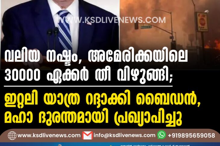 വിദേശം വലിയ നഷ്ടം, അമേരിക്കയിലെ 30000 ഏക്കര് തീ വിഴുങ്ങി; ഇറ്റലി യാത്ര റദ്ദാക്കി ബൈഡൻ, മഹാ ദുരന്തമായി പ്രഖ്യാപിച്ചുJanuary 10, 2025