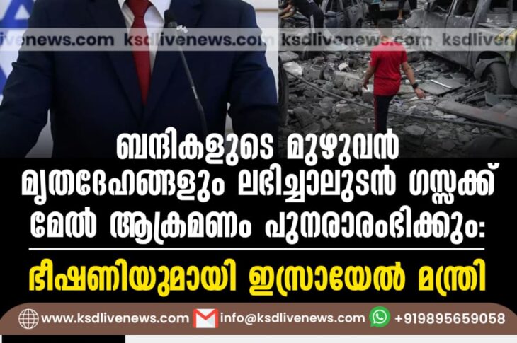വിദേശം ബന്ദികളുടെ മുഴുവന് മൃതദേഹങ്ങളും ലഭിച്ചാലുടൻ ഗസ്സക്ക് മേൽ ആക്രമണം പുനരാരംഭിക്കും: ഭീഷണിയുമായി ഇസ്രായേൽ മന്ത്രിNovember 4, 2025