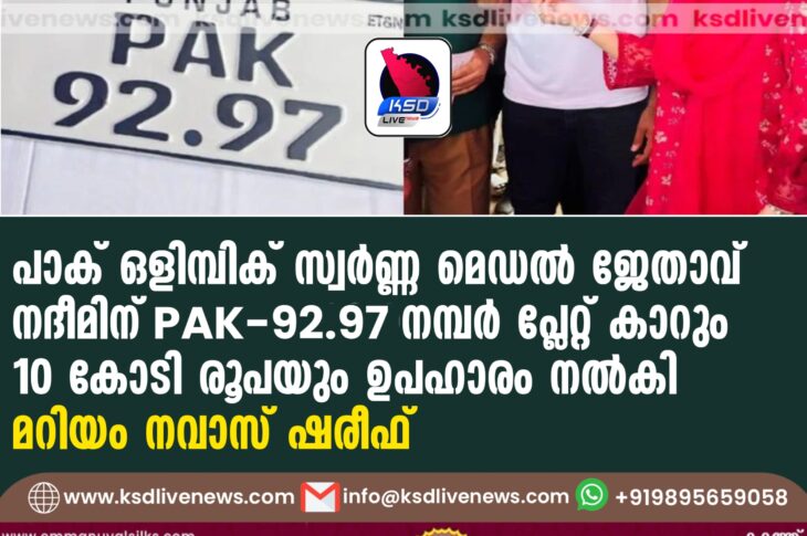വിദേശം പാക് ഒളിമ്പിക് സ്വർണ്ണ മെഡൽ ജേതാവ് നദീമിന് PAK-92.97 നമ്പര് പ്ലേറ്റ് കാറും 10 കോടി രൂപയും ഉപഹാരം നല്കി മറിയം നവാസ് ഷരീഫ്/VIDEOAugust 13, 2024