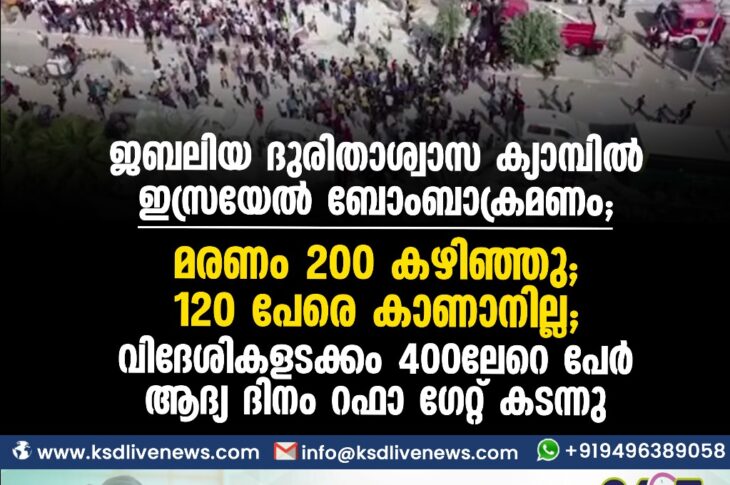 വിദേശം ജബലിയ ദുരിതാശ്വാസ ക്യാമ്പിൽ ഇസ്രയേൽ ബോംബാക്രമണം; മരണം 200 കഴിഞ്ഞു; 120 പേരെ കാണാനില്ല; വിദേശികളടക്കം 400ലേറെ പേർ ആദ്യ ദിനം റഫാ ഗേറ്റ് കടന്നുNovember 2, 2023