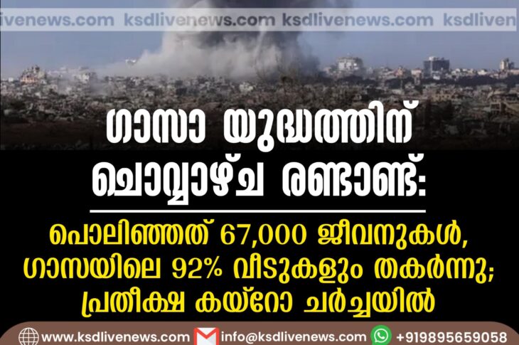 വിദേശം ഗാസാ യുദ്ധത്തിന് ചൊവ്വാഴ്ച രണ്ടാണ്ട്: പൊലിഞ്ഞത് 67,000 ജീവനുകൾ, ഗാസയിലെ 92% വീടുകളും തകർന്നു; പ്രതീക്ഷ കയ്റോ ചർച്ചയിൽOctober 6, 2025