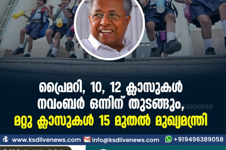 കേരളംവിദ്യാഭ്യാസം പ്രൈമറി, 10, 12 ക്ലാസുകള് നവംബർ ഒന്നിന് തുടങ്ങും, മറ്റു ക്ലാസുകള് 15 മുതല്- മുഖ്യമന്ത്രിSeptember 18, 2021