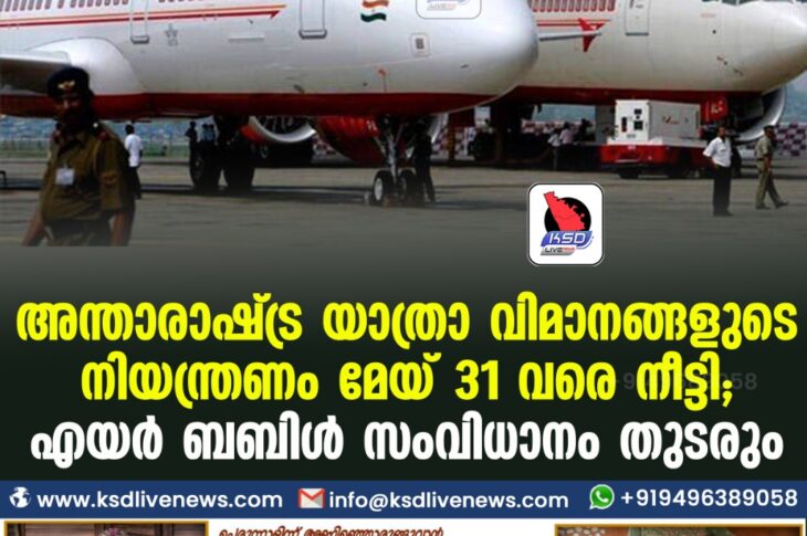 flash newsദേശീയം അന്താരാഷ്ട്ര യാത്രാ വിമാനങ്ങളുടെ നിയന്ത്രണം മേയ് 31 വരെ നീട്ടി; എയര് ബബിള് സംവിധാനം തുടരുംApril 30, 2021