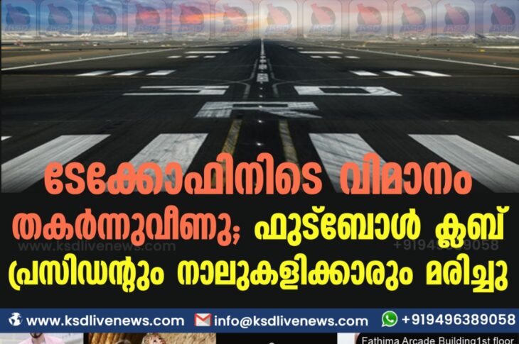 flash newsകായികം ടേക്കോഫിനിടെ വിമാനം തകര്ന്നുവീണു; ഫുട്ബോള് ക്ലബ് പ്രസിഡന്റും നാലുകളിക്കാരും മരിച്ചുJanuary 25, 2021