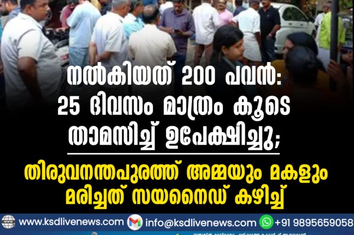 Uncategorized നൽകിയത് 200 പവൻ, 25 ദിവസംമാത്രം കൂടെ താമസിച്ച് ഉപേക്ഷിച്ചു’; തിരുവനന്തപുരത്ത് അമ്മയും മകളും മരിച്ചത് സയനൈഡ് കഴിച്ച്January 22, 2026