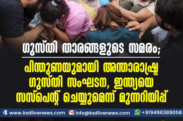 Uncategorized ഗുസ്തി താരങ്ങളുടെ സമരം; പിന്തുണയുമായി അന്താരാഷ്ട്ര ഗുസ്തി സംഘടന, ഇന്ത്യയെ സസ്പെന്റ് ചെയ്യുമെന്ന് മുന്നറിയിപ്പ്May 31, 2023