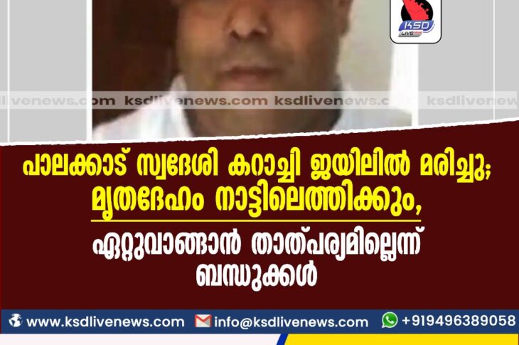 Uncategorized പാലക്കാട് സ്വദേശി കറാച്ചി ജയിലിൽ മരിച്ചു; മൃതദേഹം നാട്ടിലെത്തിക്കും, ഏറ്റുവാങ്ങാൻ താത്പര്യമില്ലെന്ന്May 22, 2023