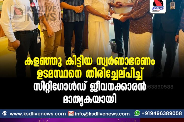 Uncategorized കളഞ്ഞു കിട്ടിയ സ്വർണാഭരണം ഉടമസ്ഥനെ തിരിച്ചേല്പിച്ച് സിറ്റിഗോൾഡ് ജീവനക്കാരൻ മാതൃകയായിSeptember 23, 2021