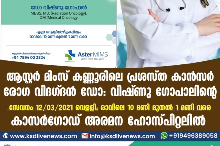 Uncategorized ആസ്റ്റർ മിംസ് കണ്ണൂരിലെ പ്രശസ്ത കാൻസർ രോഗ വിദഗ്ദൻ ഡോ : വിഷ്ണു ഗോപാലിന്റെ സേവനം 12/03/2021 വെളളി , രാവിലെ 10 മണി മുതൽ 1 മണി വരെ കാസർഗോഡ് അരമന ഹോസ്പിറ്റലിൽMarch 11, 2021