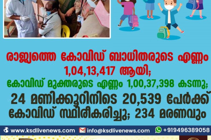 Uncategorized രാജ്യത്തെ കോവിഡ് ബാധിതരുടെ എണ്ണം 1,04,13,417 ലക്ഷം ആയി ; കോവിഡ് മുക്തരുടെ എണ്ണം 1,00,37,398 കടന്നു ;24 മണിക്കൂറിനിടെ 20,539 പേർക്ക് കോവിഡ് സ്ഥിരീകരിച്ചു ; 234 മരണവുംJanuary 8, 2021