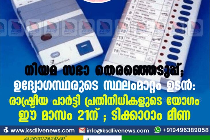 Uncategorized നിയമ സഭാ തെരഞ്ഞെടുപ്പ് ; ഉദ്യോഗസ്ഥരുടെ സ്ഥലംമാറ്റം ഉടൻ : രാഷ്ട്രീയ പാർട്ടി പ്രതിനിധികളുടെ യോഗം ഈ മാസം 21ന് ; ടിക്കാറാം മീണJanuary 9, 2021