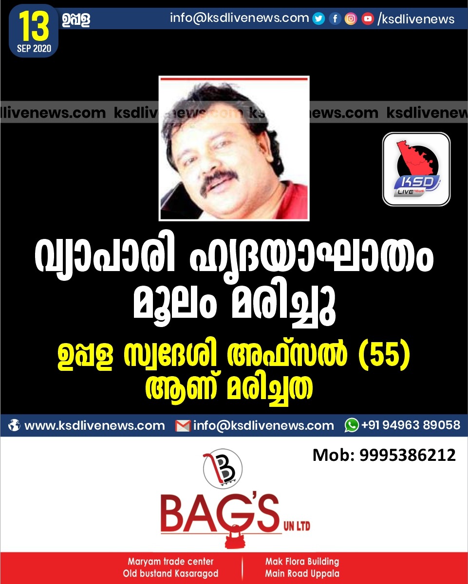 Uncategorized വ്യാപാരി ഹൃദയാഘാതം മൂലം മരിച്ചു ; ഉപ്പള സ്വദേശി അഫ്സൽ (55) ആണ് മരിച്ചത്September 13, 2020
