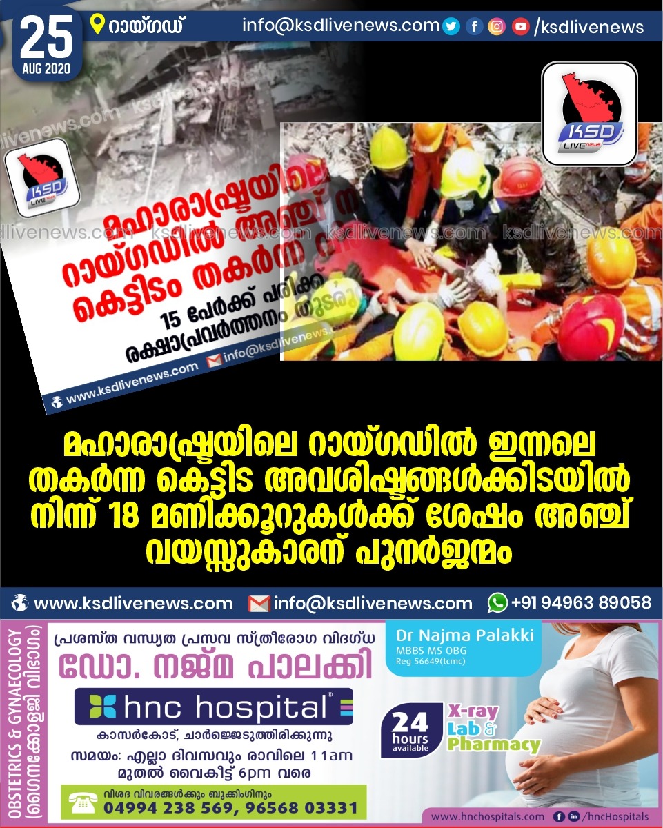 Uncategorized മഹാരാഷ്ട്രയിലെ റായ്ഗഡിൽ ഇന്നലെ തകർന്ന കെട്ടിട അവശിഷ്ടങ്ങൾക്കിടയിൽ നിന്ന് 18 മണിക്കൂറുകൾക്ക് ശേഷം അഞ്ച് വയസ്സുകാരന് പുനർജന്മംAugust 25, 2020