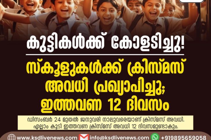 Uncategorized കുട്ടികൾക്ക് കോളടിച്ചു! സ്കൂളുകള്ക്ക് ക്രിസ്മസ് അവധി പ്രഖ്യാപിച്ചു; ഇത്തവണ 12 ദിവസംDecember 12, 2025
