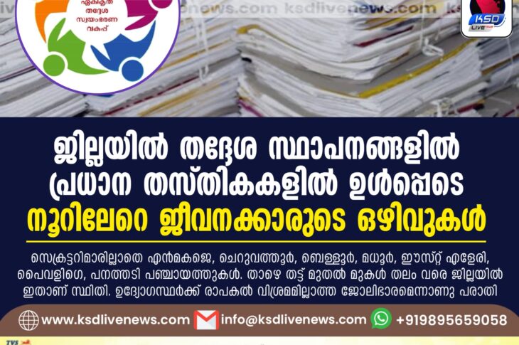 Uncategorized ജില്ലയിൽ തദ്ദേശ സ്ഥാപനങ്ങളിൽ പ്രധാന തസ്തികകളിൽ ഉൾപ്പെടെ നൂറിലേറെ ജീവനക്കാരുടെ ഒഴിവുകൾOctober 25, 2024