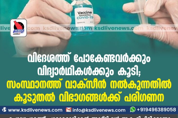 കേരളം വിദേശത്ത് പോകേണ്ടവർക്കും വിദ്യാർഥികൾക്കും കൂടി; സംസ്ഥാനത്ത് വാക്സീൻ നൽകുന്നതിൽ കൂടുതൽ വിഭാഗങ്ങള്ക്കMay 28, 2021